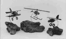 wood. Bodies are made from spark plugs and wings are made of steel.