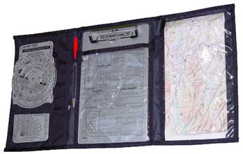 Flightline's VFR tri-fold features right-panel clear vinyl pocket, clear center pocket, brushed alumninum VFR kneeboard. VFR information is silkscreened clearly on the board. Pen/pencil holder, left panel has large pockets with two elastic straps. Nylon and velcro legband.